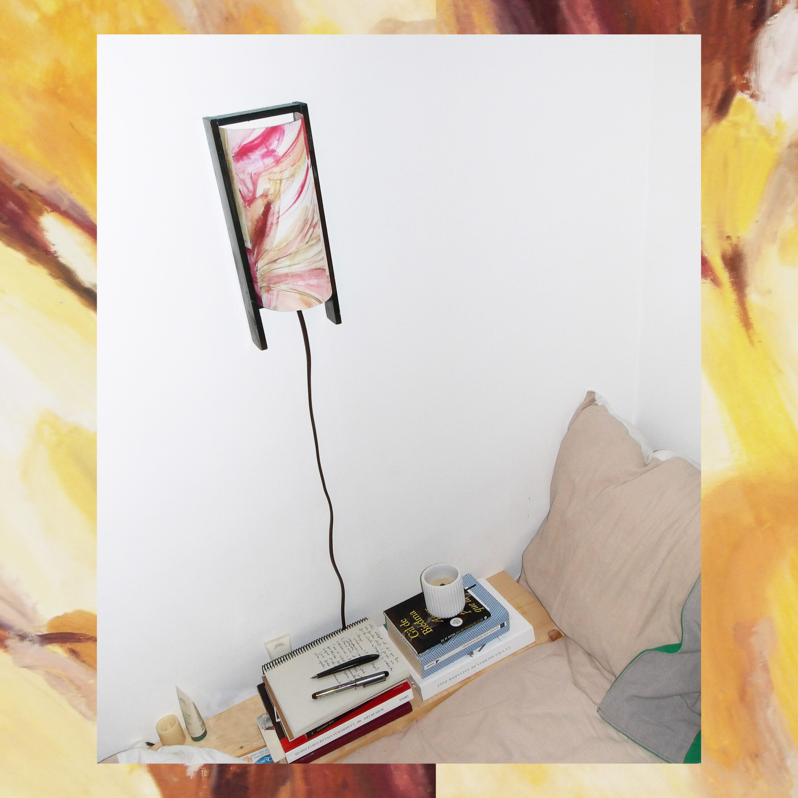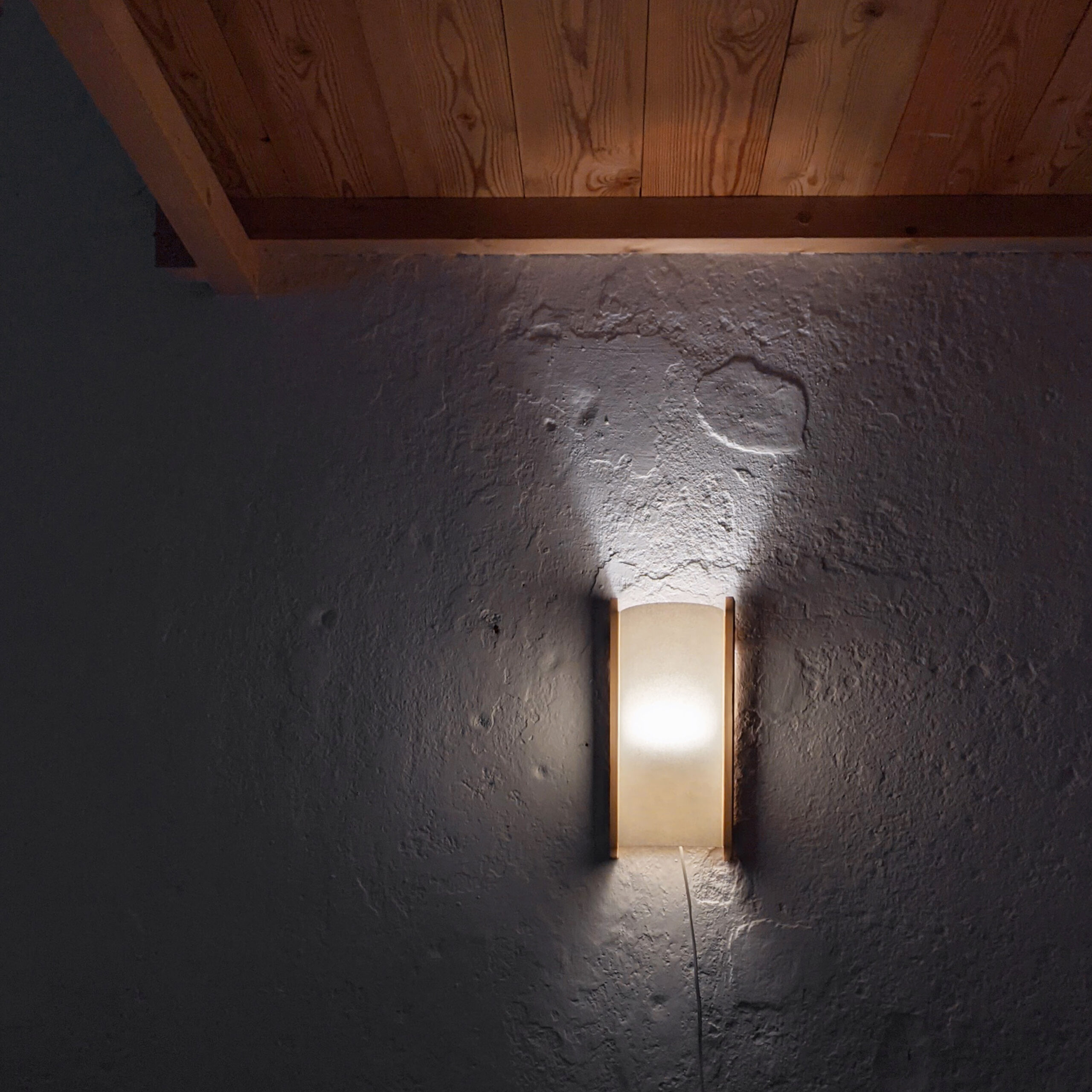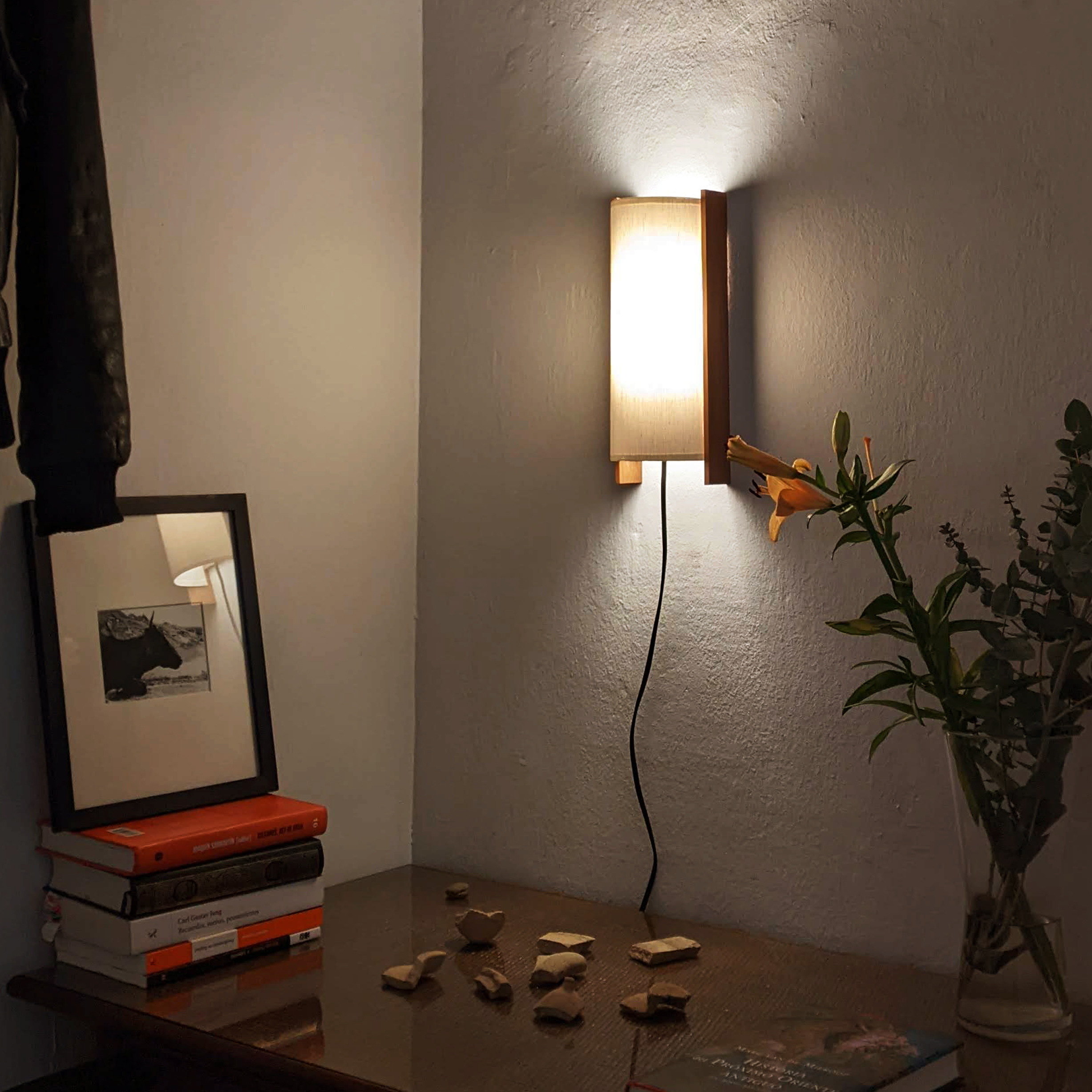 El modelo Estudio es una lámpara de aplique con una estructura de madera de cerezo y una pantalla de lino a la catalana. Está hecha a mano en el Barceloés, y cada pieza es un objeto único de artesania. De diseño directo y sencillo – un arco comprimido por un marco – proporciona una luz càlida y tamizada.